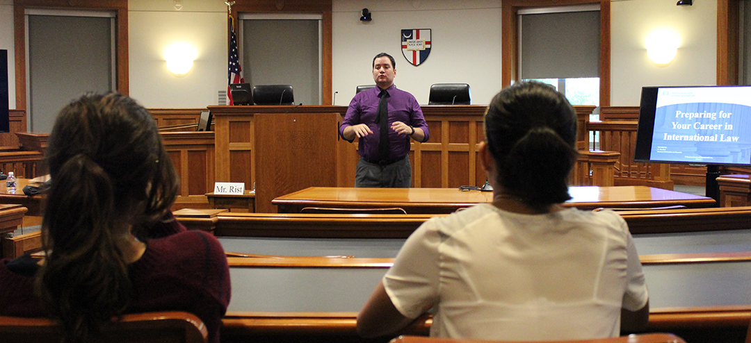 On October 20th, students gathered in the Slowinski Court Room at the Columbus School of Law to attend a presentation entitled "Pursuing a Career in International Law," which explored the various avenues students can take if they are interested in obtaining a job in international law.